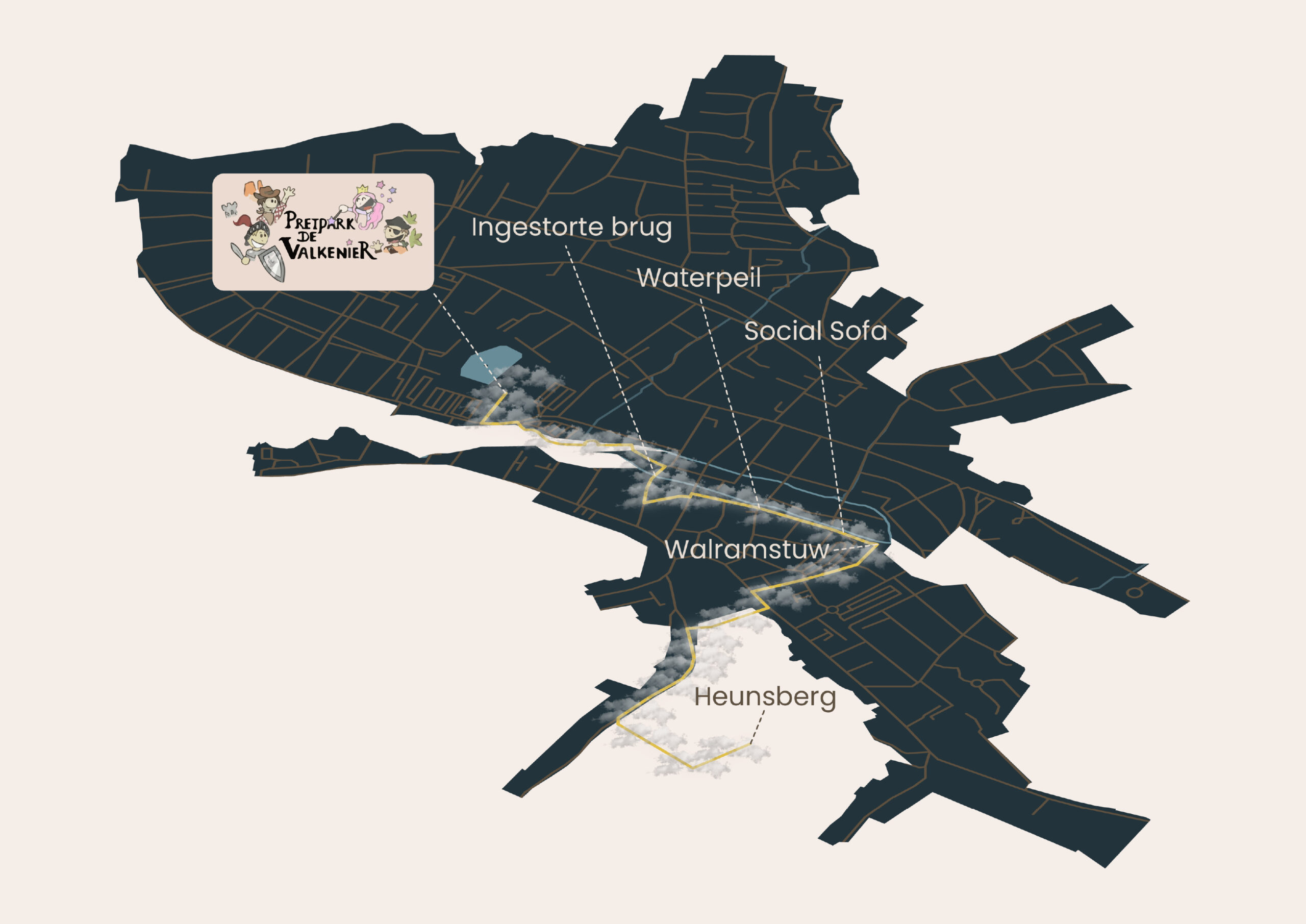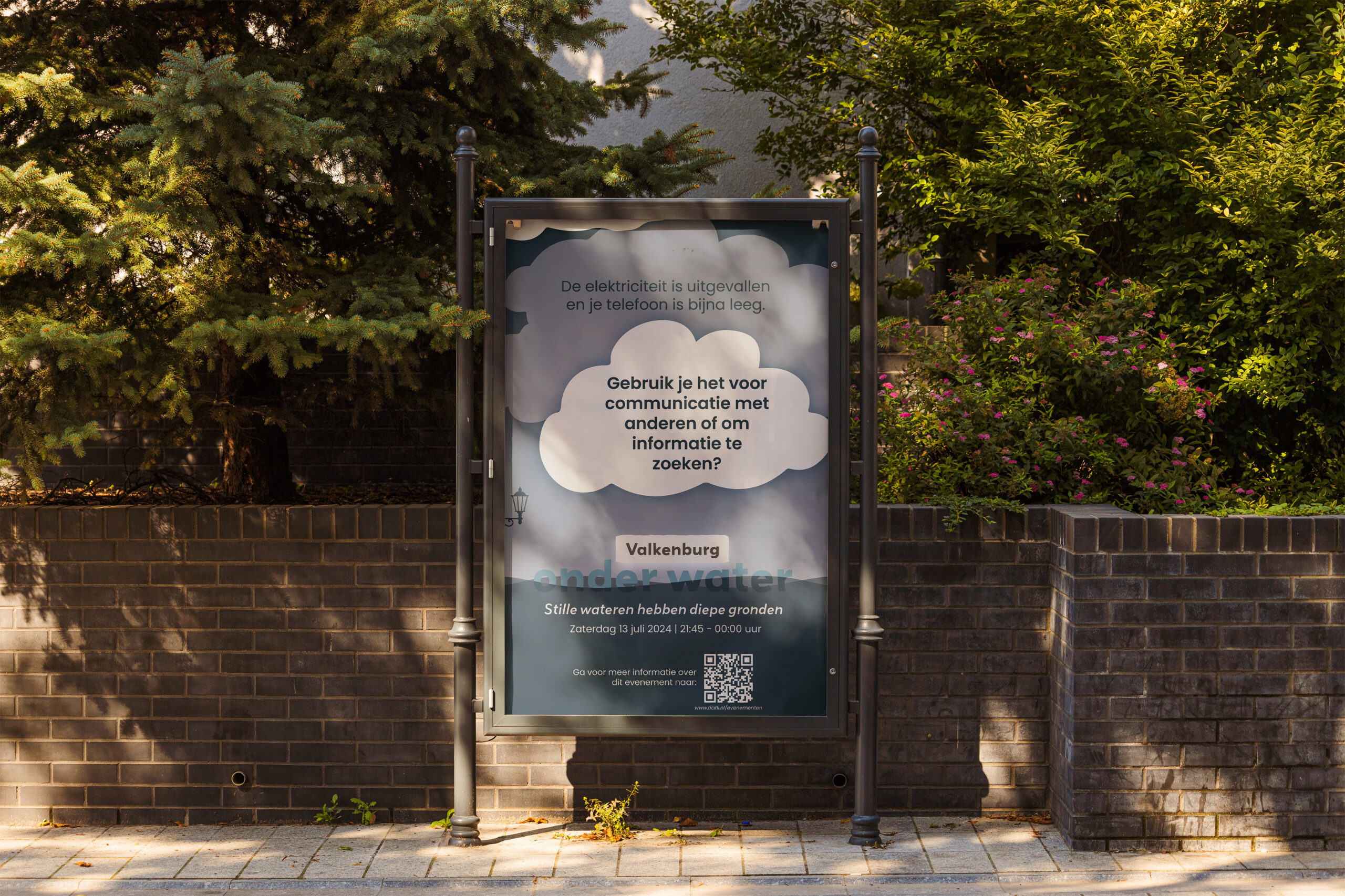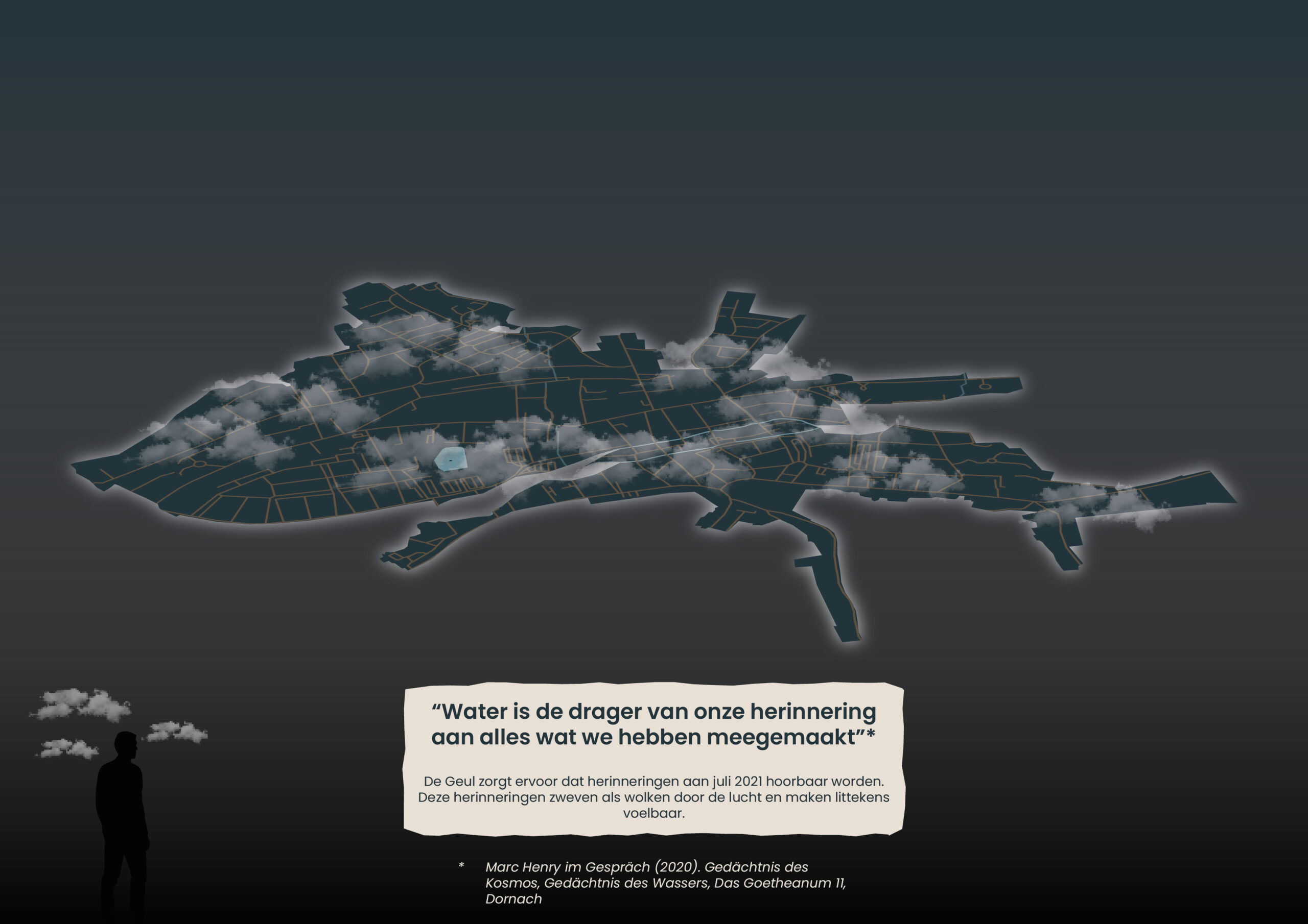 Ik ben geregeld in het prachtige en rustige Zuid-Limburg te vinden, maar het gebied heeft ook haar keerzijde. In Valkenburg vond in juli 2021 namelijk een overstroming plaats. Uit onderzoek blijkt dat alle steden in Nederland een kans van 1:100 jaar hebben om te overstromen. Echter is de kans op een overstroming in Limburgse steden veel hoger (1:25). Om inwoners bewust te maken van deze hoge kans op een overstroming, heb ik een GPS-gebaseerde audiobeleving ontworpen. Herinneringen aan 2021 worden opgehaald en tijdens een route wordt er symbolisch een weg uit het water gezocht. Om precies te laten zien om welk gebied het gaat, wordt de straatverlichting rond zonsondergang uitgezet.